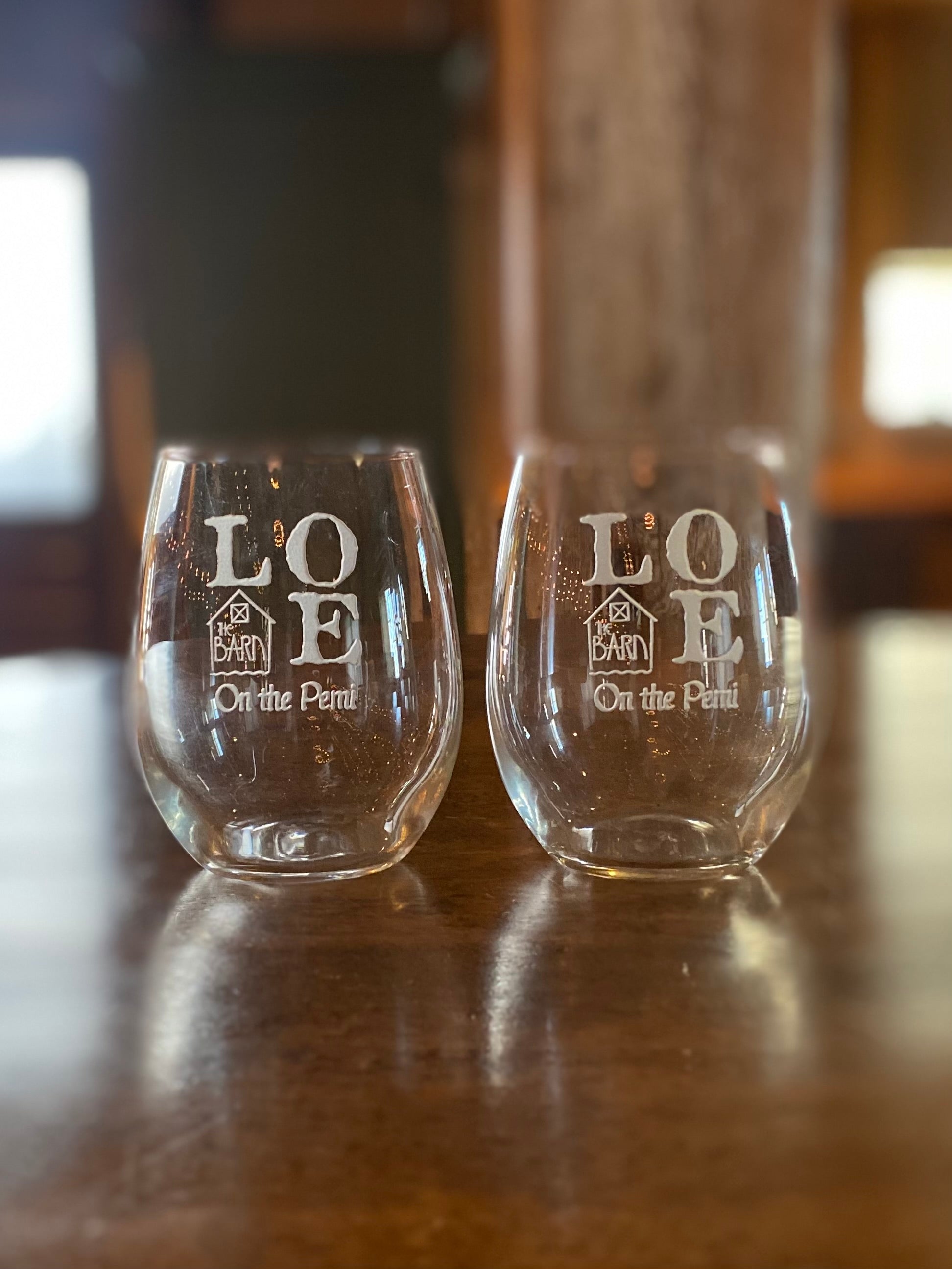 Etched crystal stemless wine glasses with The Barn on the Pemi logo.