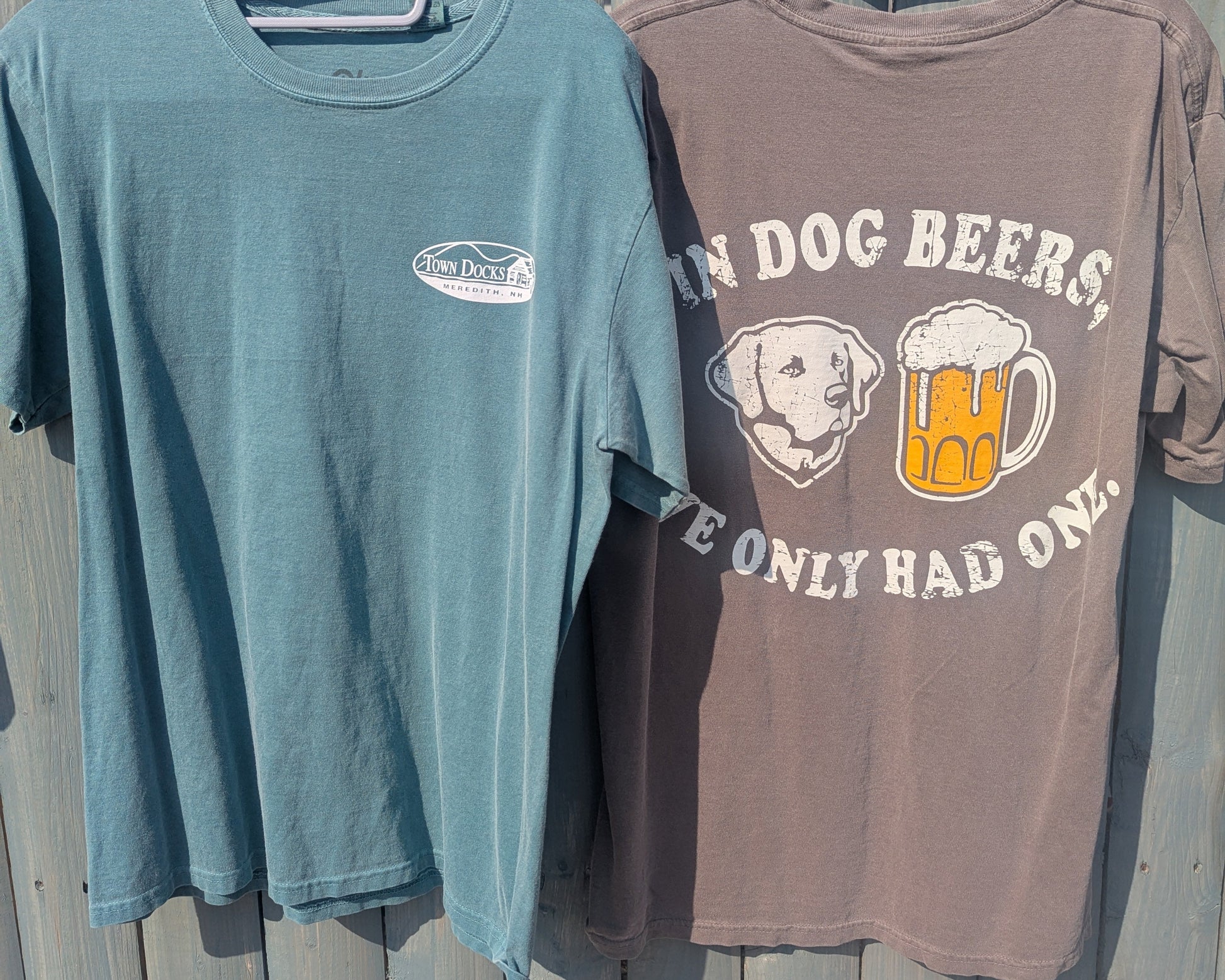Shirt features Town Docks logo on the front chest, and "In Dog Beers I've Only Had One" graphic on the back. Soft Cotton material.