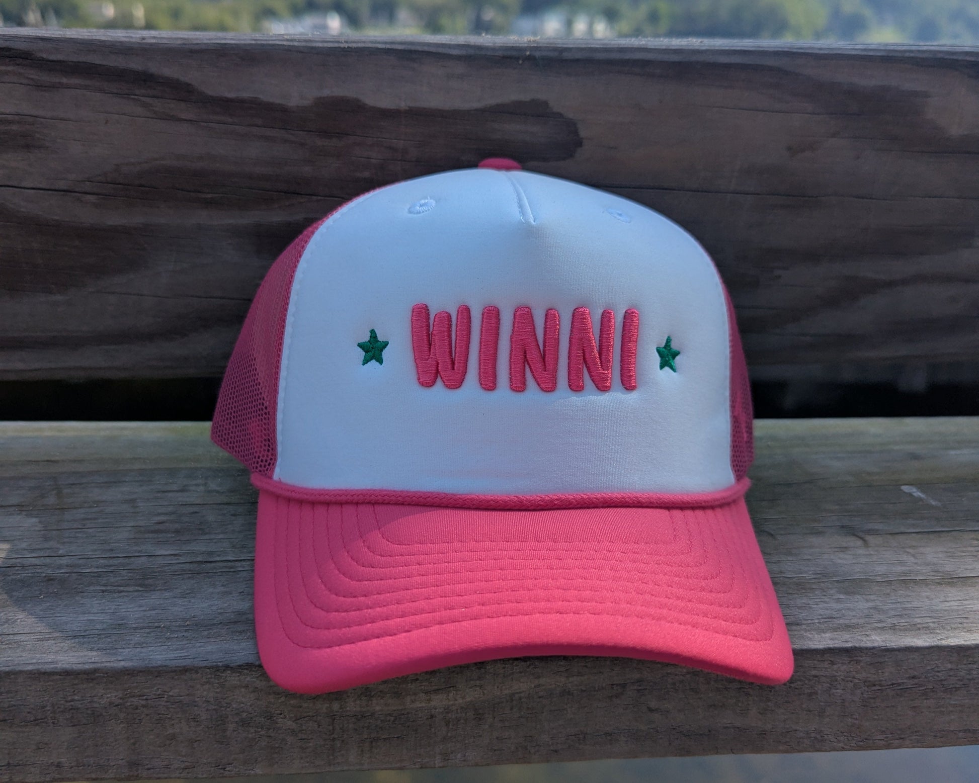 Foam/Mesh Trucker Hat, with "Winni" embroidered in choice of bright pink or green.