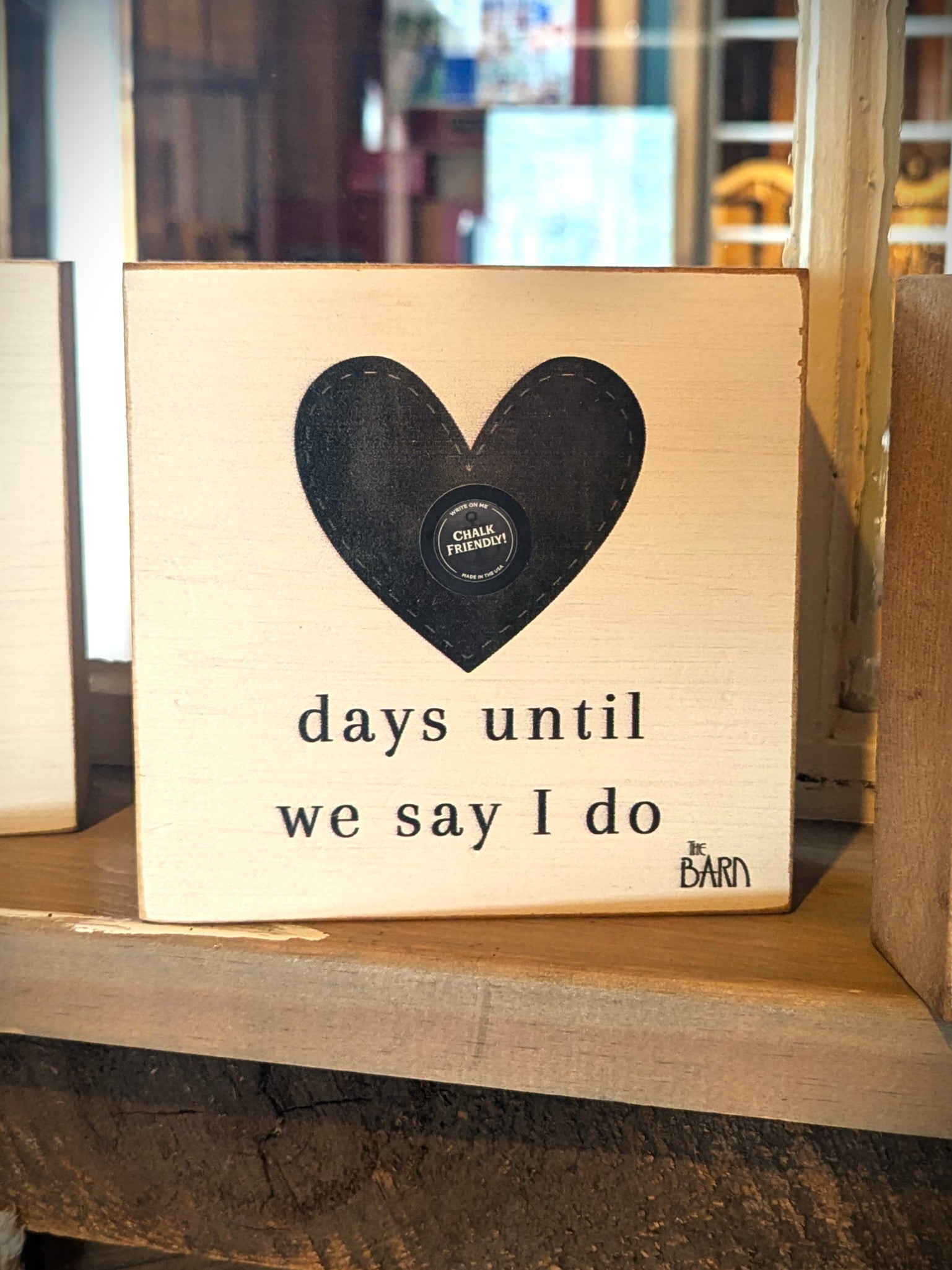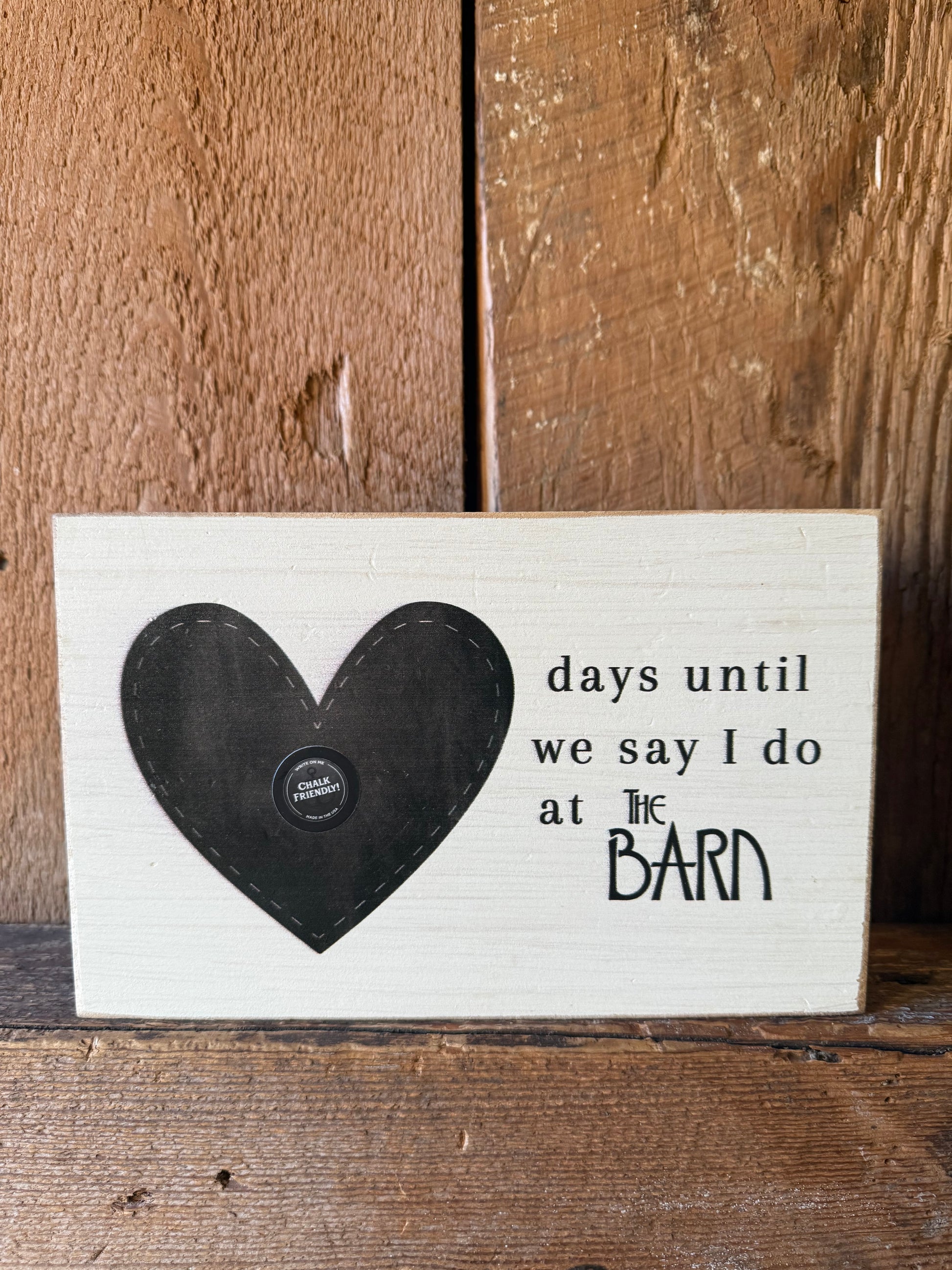 Count down the days until your big day! This wooden block style sign has a chalk friendly heart, that allows you to update your countdown daily. Available in two sizes..